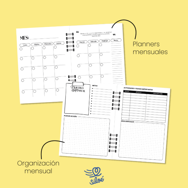 - Planner Mensual Perpetuo (Lo empezas en cualquier momento del año); Vista para mes, espacio para actividad y fechas importantes, Notas e ideas